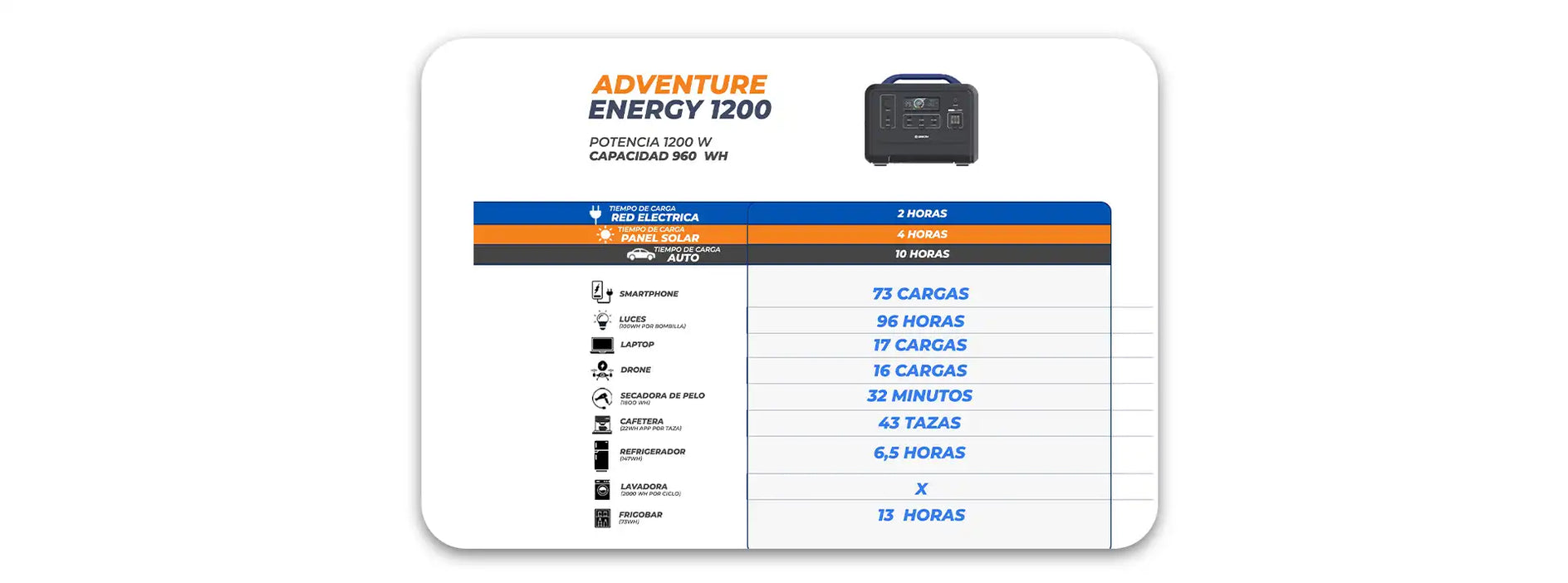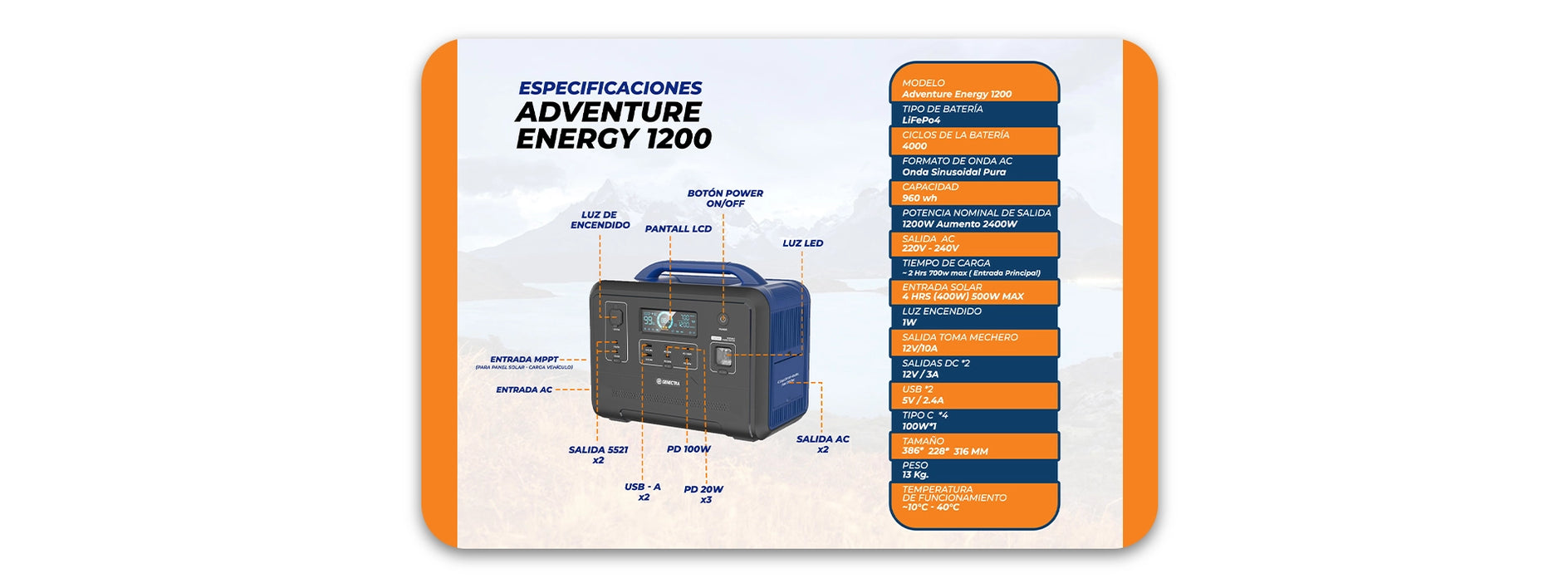 Estación de Energía Solar ADVENTURE ENERGY 1200w 960Wh